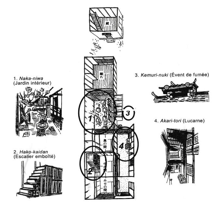 1. Le fameux jardin intérieur, appelé naka-niwa, fait littéralement le pont entre la maison principale, une pièce détachée (qu’on appelle hanare) et une pièce d’entreposage (kura) à l’arrière. Le tout offrant un accès à la salle de bain et aux toilettes.