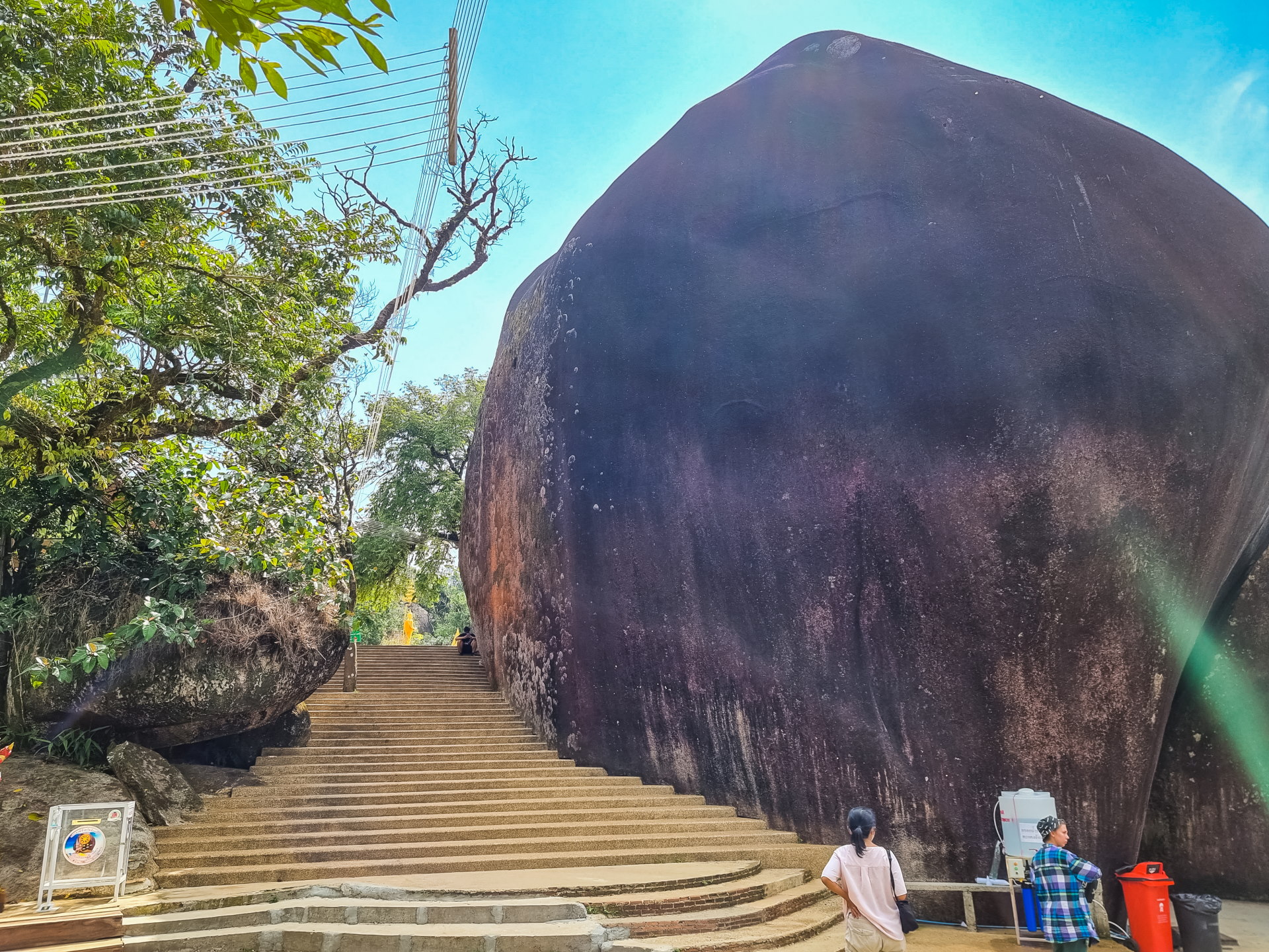 En voyant ce gros rocher posé là en équilibre, je ne peux m’empêcher de faire un certain parallèle avec le rocher d’or de Kyaiktiyo, l’accès un peu folklo en véhicule inclus. On y retrouve à la fois cet aspect religieux / pèlerinage et un gros rocher se démarquant dans la montagne. Mais la comparaison s’arrête là.