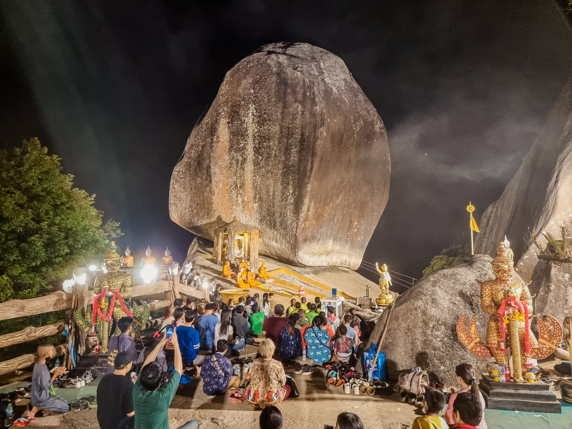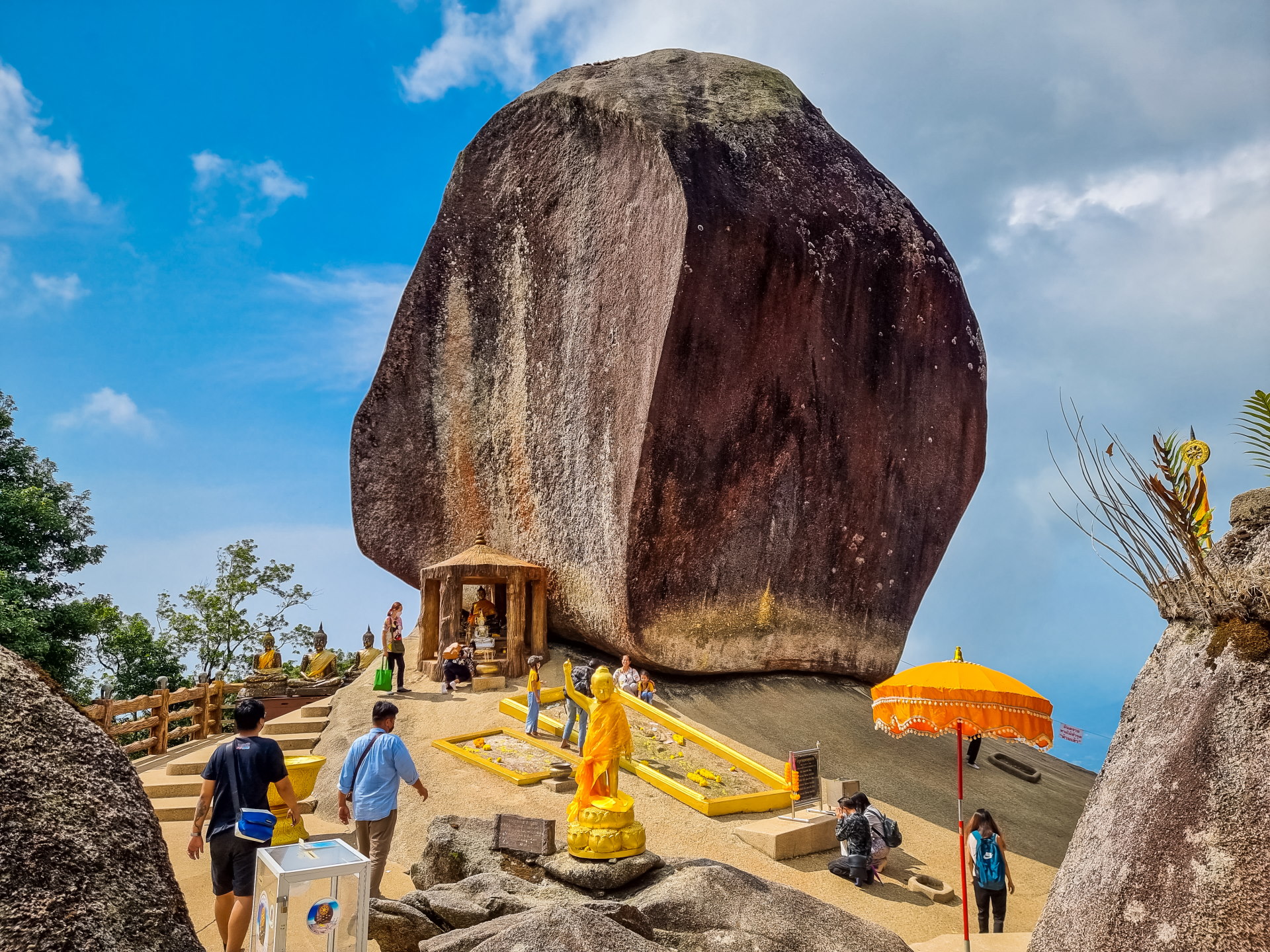 Ici, le rocher est moins en position d’équilibre et il n’est pas recouvert de dorure comme chez le pays voisin. L’autre grosse différence, outre la saisonnalité, c’est qu’on a pas toute une mini-ville qui s’est développée autour : on ne compte ici qu’un bâtiment servant à abriter les moines qui bénissent à la chaîne, et quelques kiosques pour effectuer toutes sortes de donations.