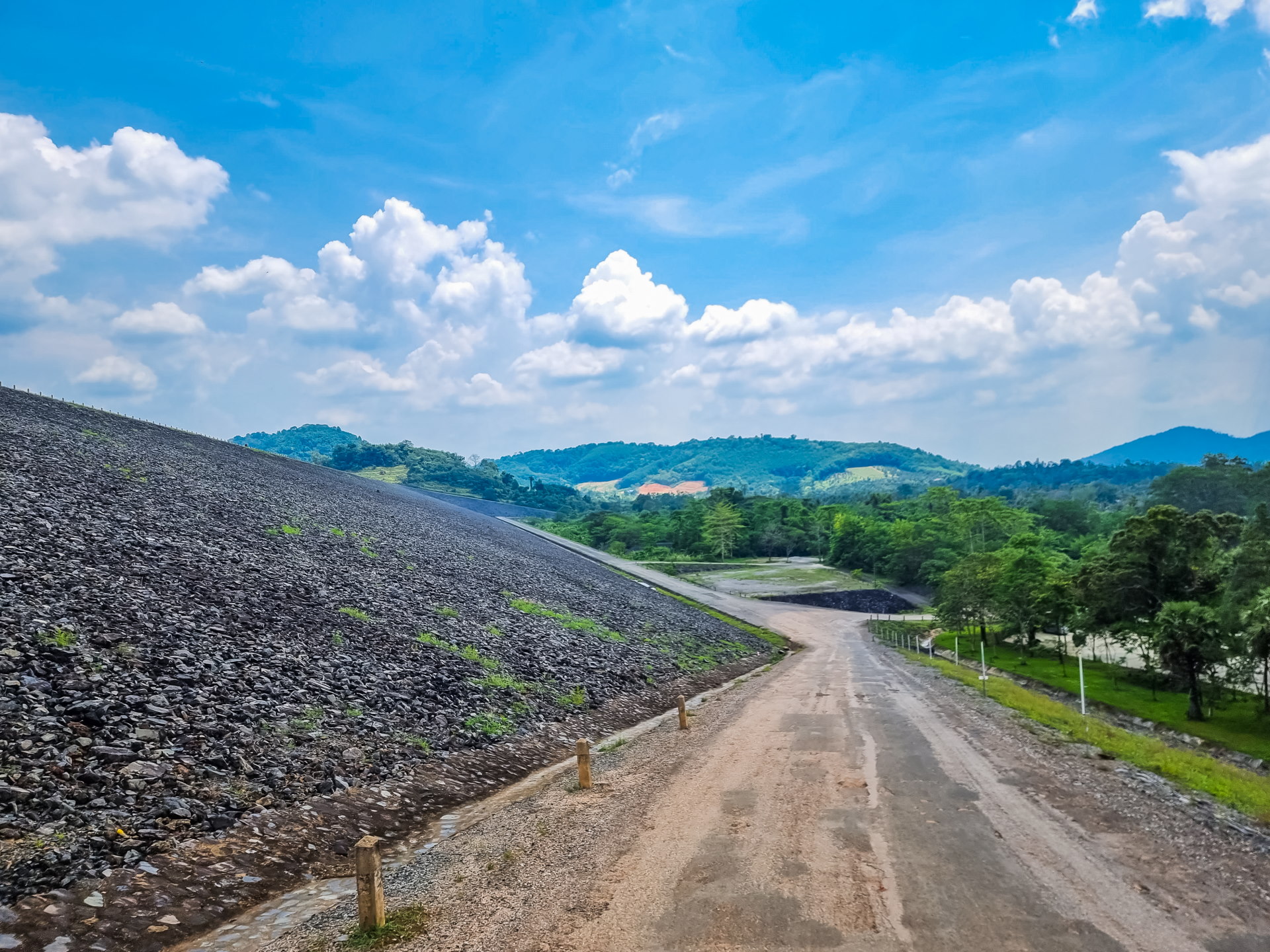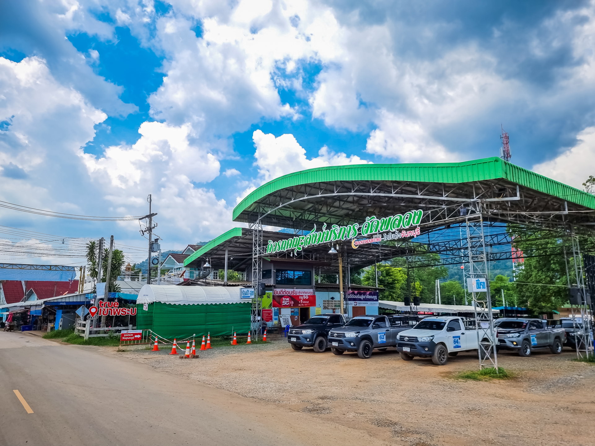 Depuis le Wat Phluang, on rejoint très vite le pied du barrage, que l’on gravit ensuite par une route longeant l’impressionnante structure. Peu après, les véhicules marquent un arrêt au poste de garde forestier, puisqu’il faut payer l’entrée au parc national séparément du transport (200 bahts pour les étrangers).