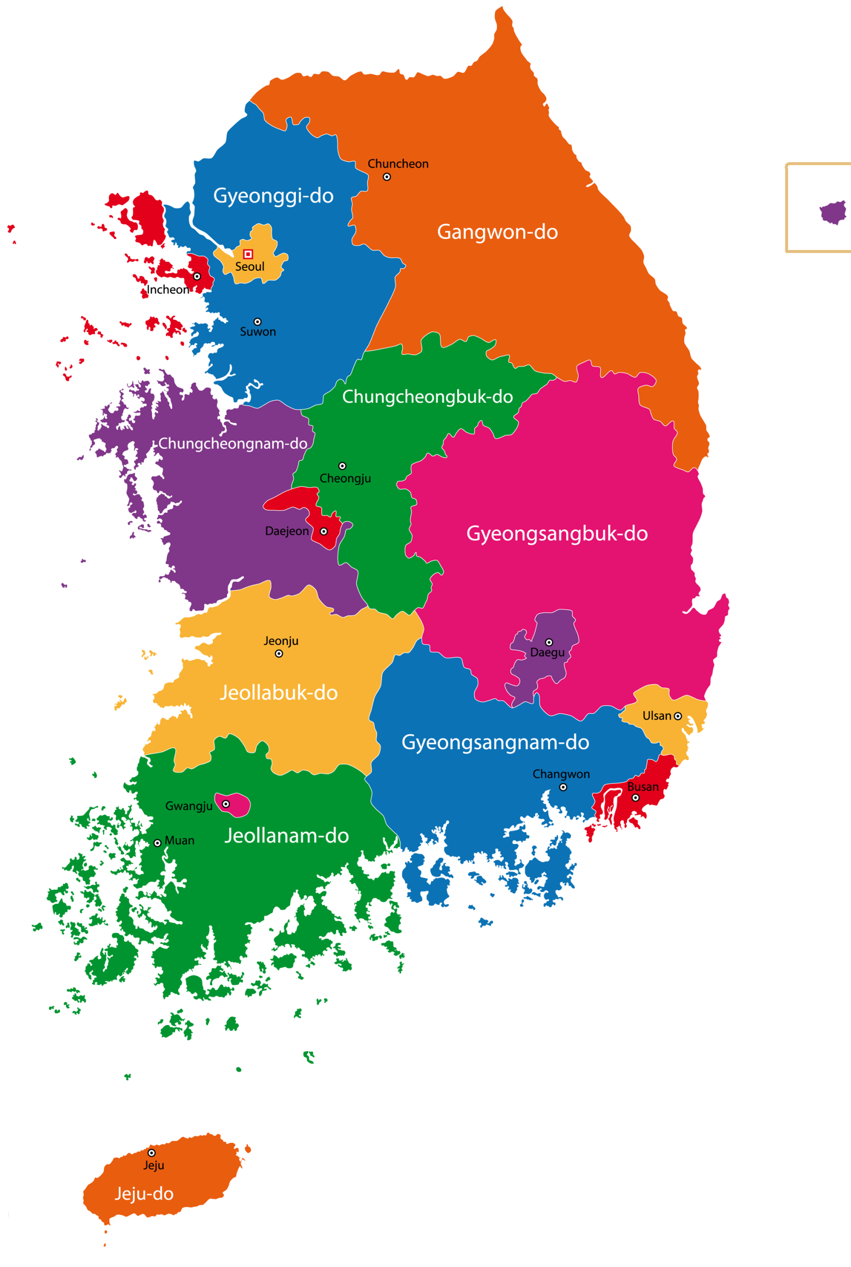 South Korea has 17 entities : 9 provinces (-do), 6 metropolitan cities (-gwangyeoksi) and 2 cities with special status : Seoul et sejongThis map provides the main landmarks useful for planning your route.