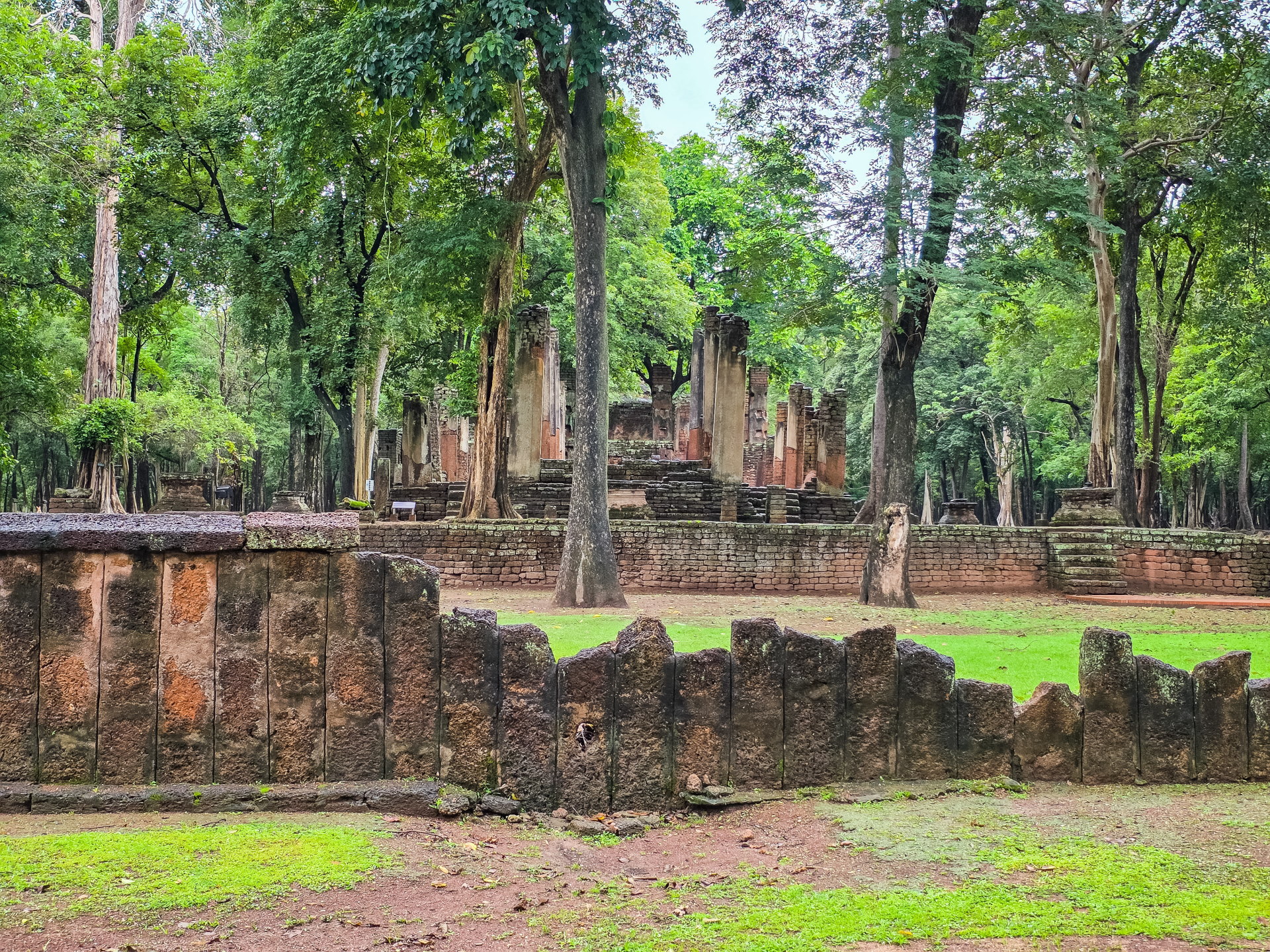Around the mandapa, there are several small chedis and the foundations of what was probably the monks' quarters. The whole area is very pleasant to explore: the temple is nestled under large trees, and the forest setting reinforces the timeless atmosphere that is so characteristic of Kamphaeng Phet.