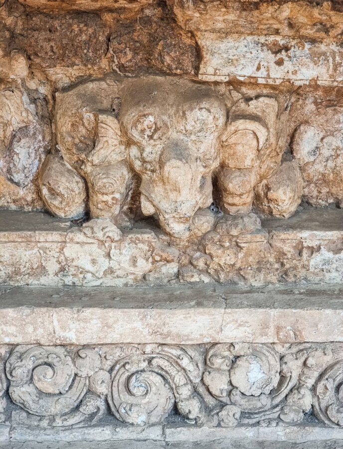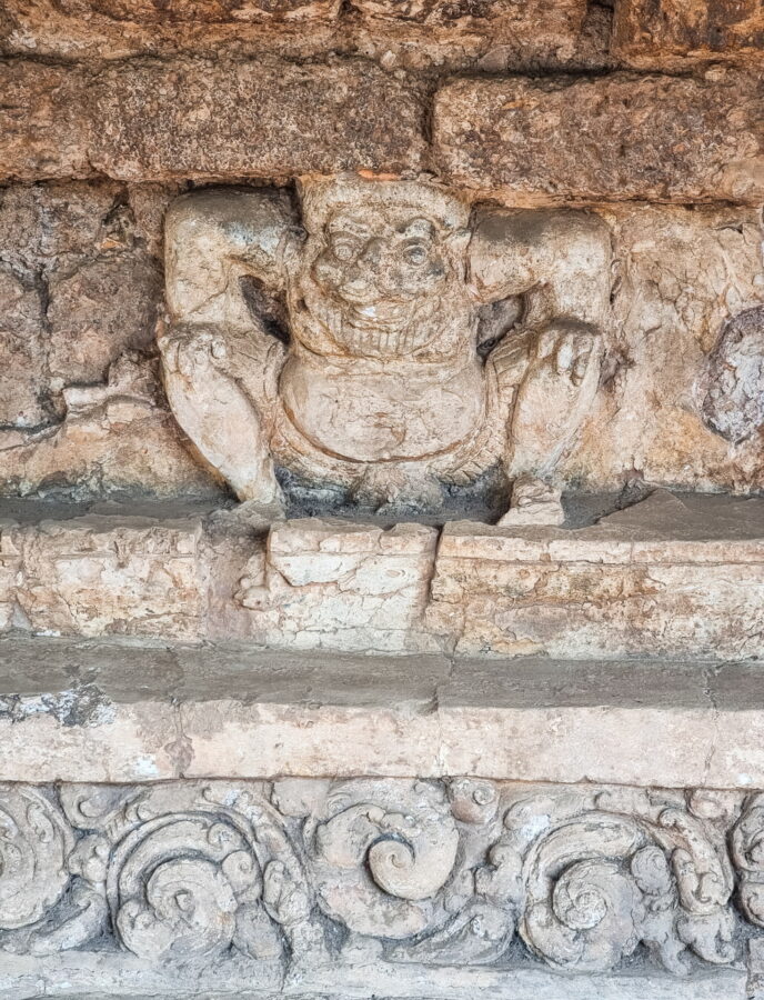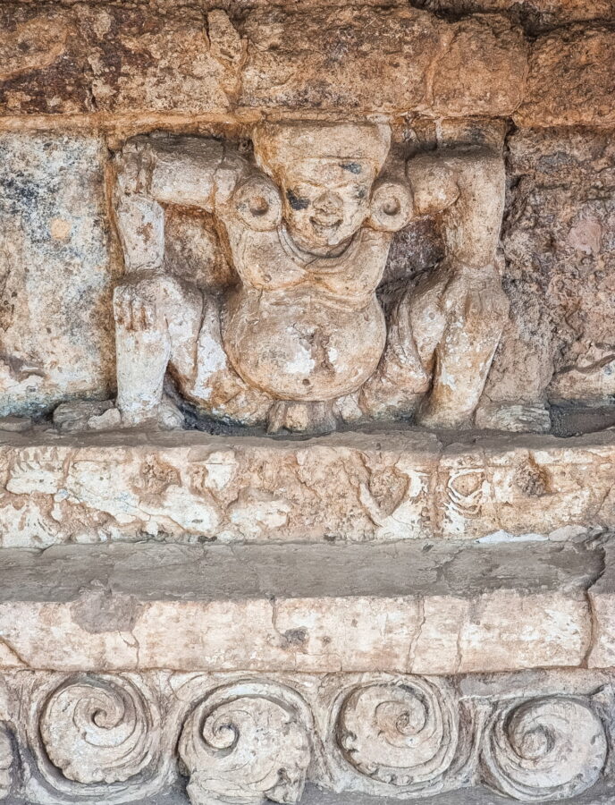 The monument is particularly notable for its laterite base, once decorated with stucco. A row of floral motifs can still be seen, topped by a gallery of figures in the position of "Atlantes" - figures symbolically serving as architectural support and protectors.