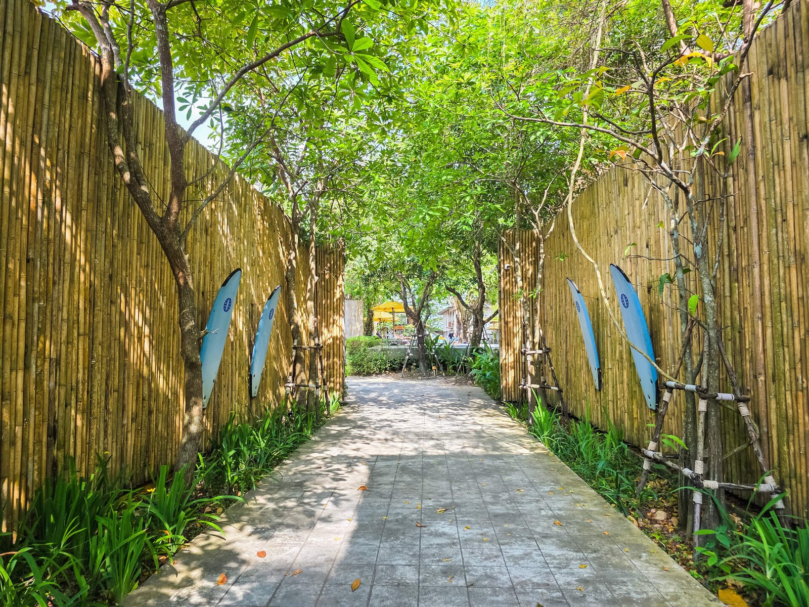 Le passage surélevé est bordé de bambous ; nul doute que c’est un spot à selfies quand il y a du monde. Le pont bleu mène alors vers une petite zone aménagée pour le camping, avec des toilettes et des bungalows, mais qui ne semblent pas avoir servi depuis quelque temps. M’est avis que le COVID a pu freiner les ambitions et casser la dynamique de ce point de vue.