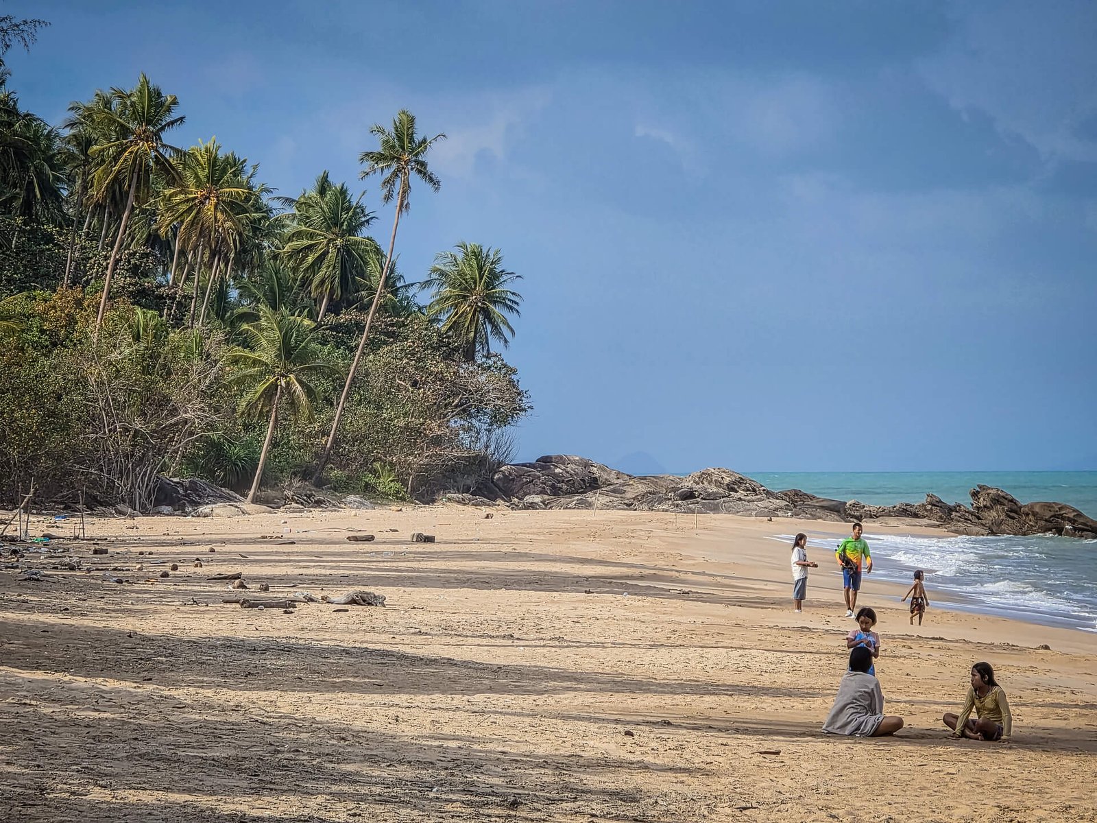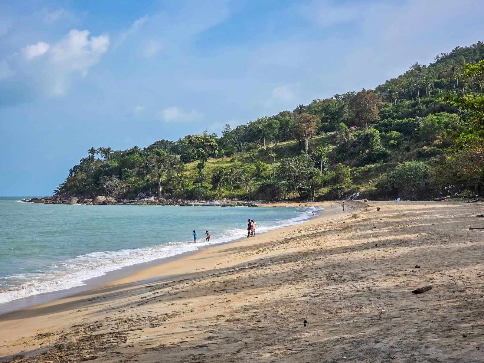 Cette fois, un parking invite clairement à s’arrêter, et la vue donne sur une plage portant deux noms : Ao Thong Yang, mais aussi Phlai Dam Beach. Si là encore la végétation domine les environs, ce n’est pas désert pour autant puisqu’on y aperçoit une dizaine de vacanciers et leurs enfants en train de profiter des joies du bord de mer.