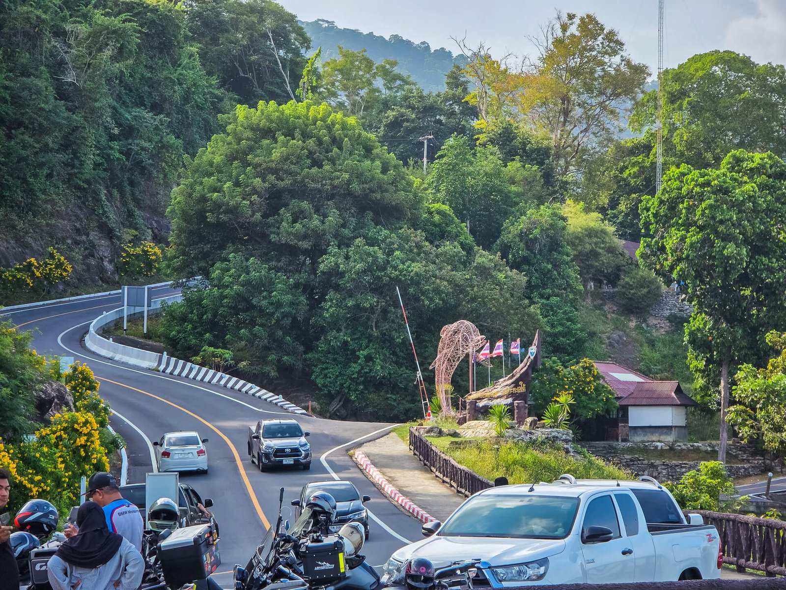 Un piédestal surmonté d’une statue d’éléphant complète la déco de cette aire de repos qui attire tous les visiteurs de passage. C’est d’ailleurs là qu’on croisait le plus de monde sur cette route, dont un groupe de bikers malaisiens, souvent nombreux à visiter cette partie sud de la Thaïlande avec leur véhicule.