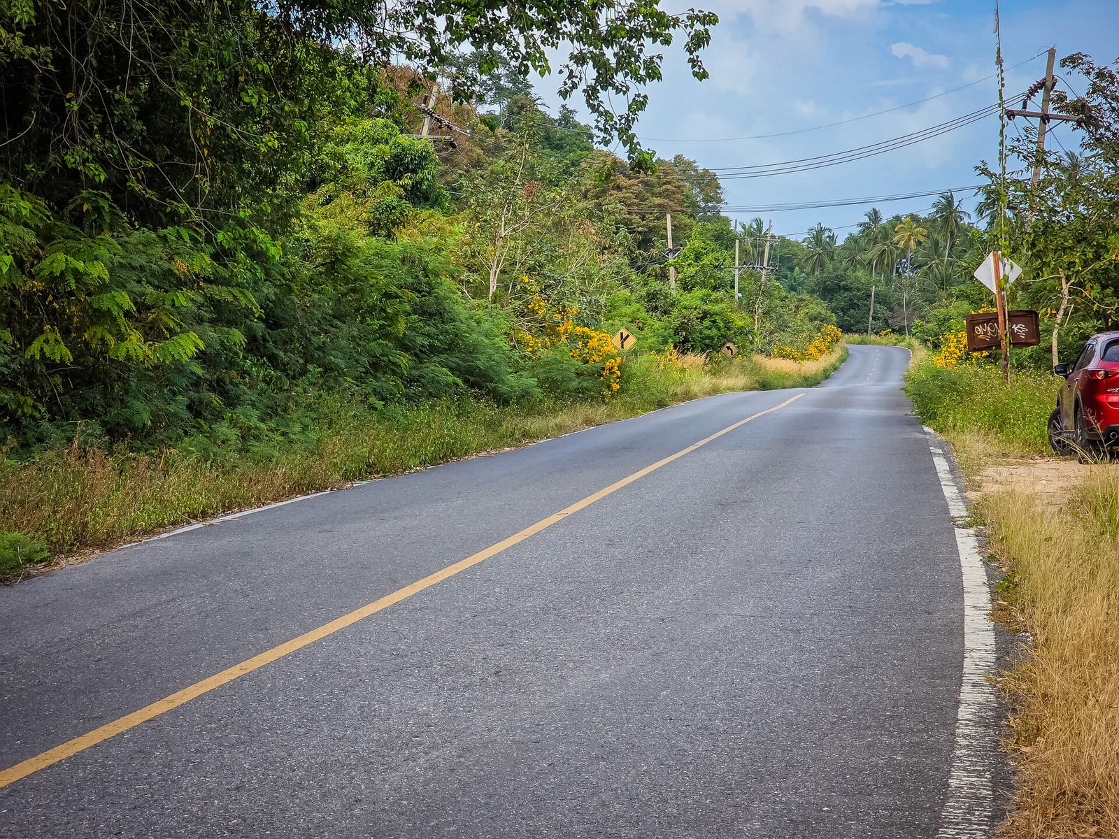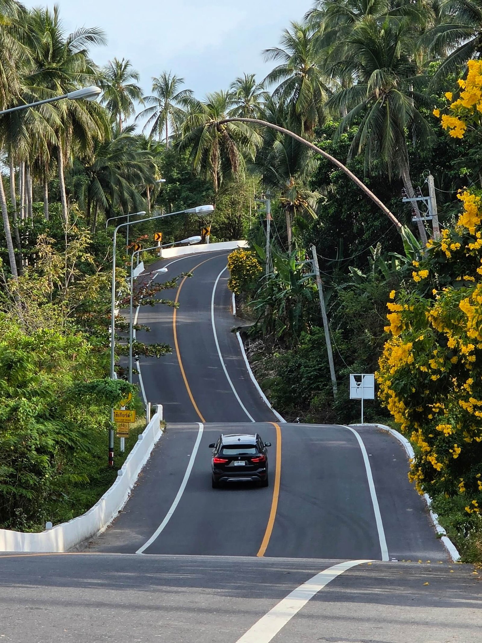 Sa particularité tient à son allure de serpent goudronné ondulant sur la colline, le tout bordé de cocotiers et, dans notre cas, embelli par la floraison d’arbustes aux fleurs jaunes.