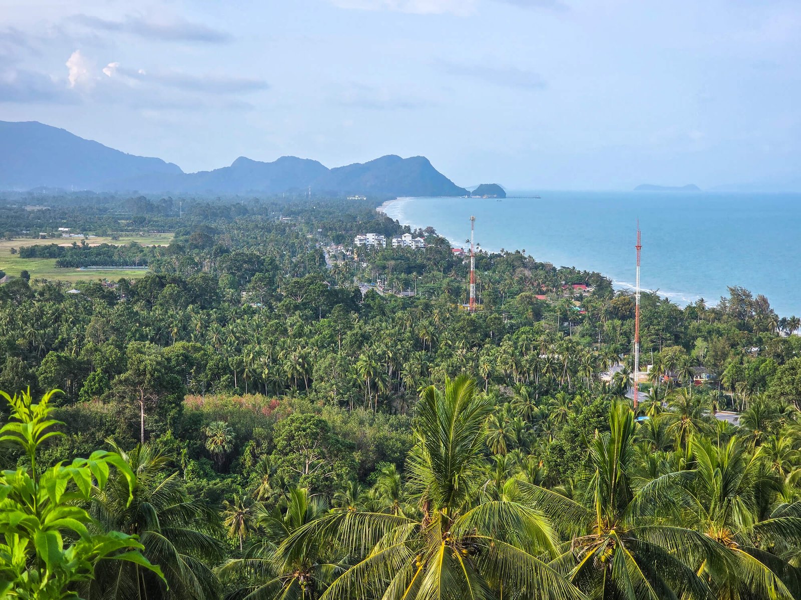 On démarre par la plateforme principale, qui possède une vue privilégiée sur tout Khanom, avec des pitons rocheux karstiques visibles au loin dans cette partie nord de la province de Nakhon Si Thammarat.