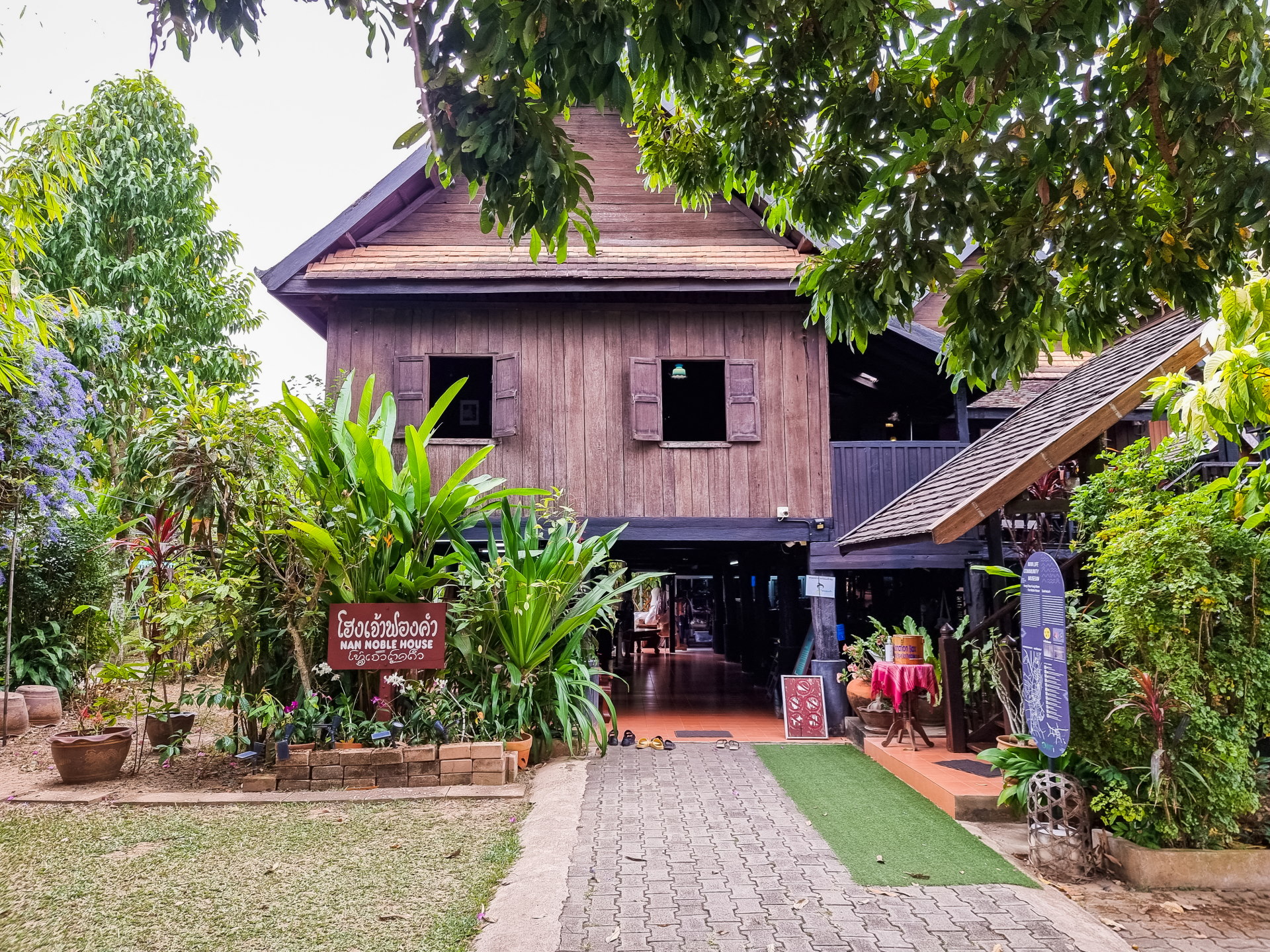 - Thananuson Royal House : située juste en face du Wat Phumin, c’est une maison surélevée en bois, d’aspect plus modeste. Elle aurait appartenu à Luang Thananusorn, un haut dignitaire, plus précisément agent du Trésor provincial de Nan. Du peu d’infos que je trouve, elle daterait de la fin du XIXe ou du début du XXe siècle. L’intérieur ne se visite pas, mais la cour est libre puisqu’elle accueille un café de la marque Amazon (le Starbucks local).