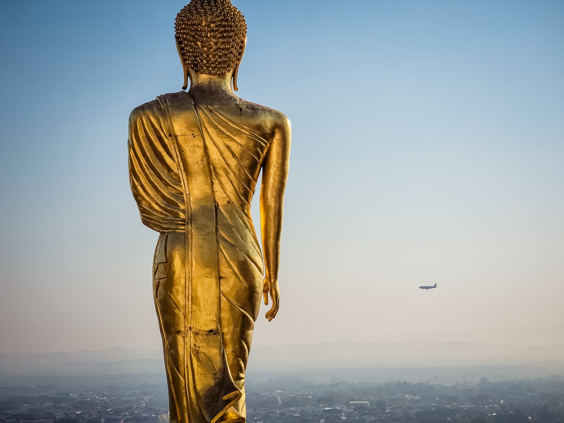 C’est typiquement l’exemple de temple où l’on ne vient pas spécifiquement pour le bâtiment en lui-même, mais pour profiter de son emplacement dominant. C’est d’ici que vous pourrez obtenir un cliché souvenir de Nan, avec une grande statue de Bouddha marchant, de style Sukhothaï, dressée sur un piédestal circulaire, qui domine la vallée.